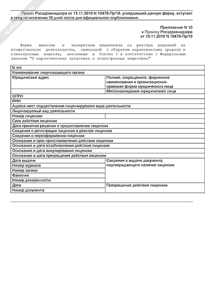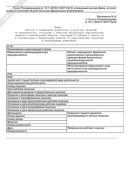 - 3976Форма выписки о конкретном лицензиате из реестра лицензий на осуществление деятельности, связанной с оборотом наркотических средств и психотропных веществ, внесенных в Список I в соответствии с Федеральным законом «О наркотических средствах и психотропных веществах»