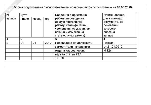 - 3980Форма записи в трудовой книжке о переводе работника на другую работу