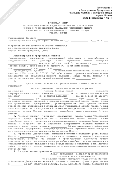 - 399Примерная форма распоряжения префекта административного округа города Москвы о предоставлении гражданину служебного жилого помещения из специализированного жилищного фонда города Москвы