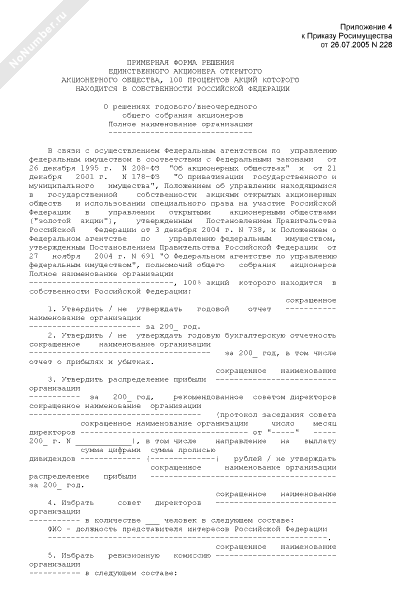 - 396Примерная форма решения единственного акционера открытого акционерного общества, 100 процентов акций которого находится в собственности Российской Федерации