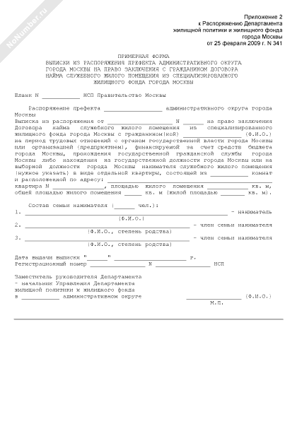 - 400Примерная форма выписки из распоряжения префекта административного округа города Москвы на право заключения с гражданином договора найма служебного жилого помещения из специализированного жилищного фонда города Москвы