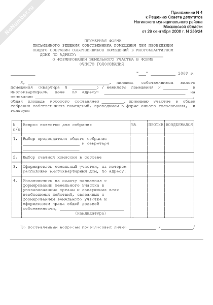 - 435Примерная форма письменного решения собственника помещения при проведении общего собрания собственников помещений в многоквартирном доме в городе Ногинске Московской области о формировании земельного участка в форме очного голосования