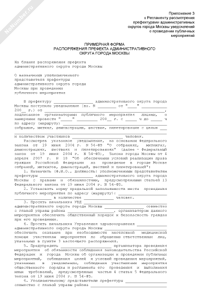 - 425Примерная форма распоряжения префекта административного округа города Москвы о назначении уполномоченного представителя префектуры административного округа города Москвы при проведении публичного мероприятия