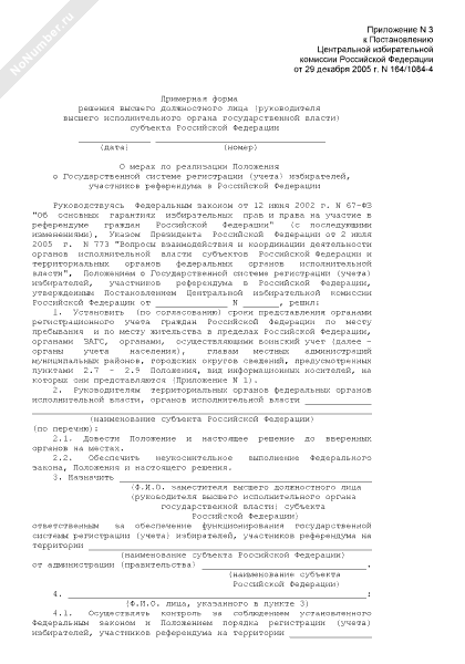 - 439Примерная форма решения высшего должностного лица (руководителя высшего исполнительного органа государственной власти) субъекта Российской Федерации о мерах по реализации Положения о Государственной системе регистрации (учета) избирателей, участников референдума в Российской Федерации