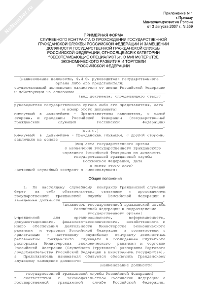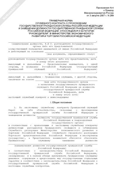 - 433Примерная форма служебного контракта о прохождении государственной гражданской службы Российской Федерации и замещении должности государственной гражданской службы Российской Федерации, относящейся к категории «обеспечивающие специалисты», в Министерстве экономического развития и торговли Российской Федерации