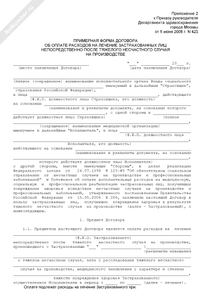 - 444Примерная форма договора об оплате расходов на лечение застрахованных лиц непосредственно после тяжелого несчастного случая на производстве в г. Москве