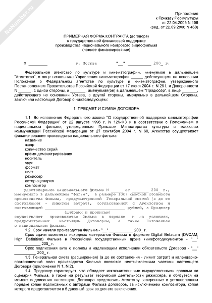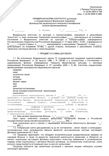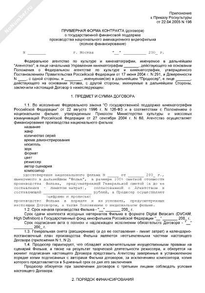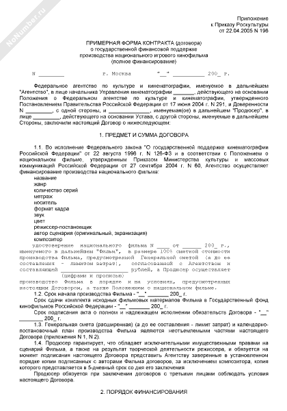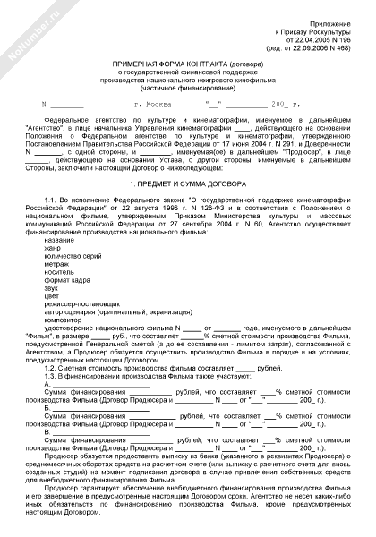 - 449Примерная форма контракта (договора) о государственной финансовой поддержке производства национального неигрового видеофильма (полное финансирование)