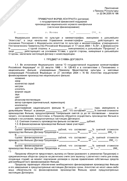 - 445Примерная форма контракта (договора) о государственной финансовой поддержке производства национального игрового кинофильма (частичное финансирование)