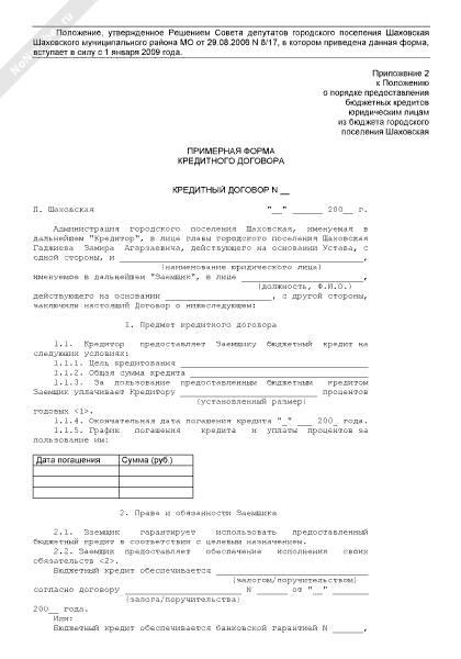 - 453Примерная форма кредитного договора, заключенного между юридическим лицом и администрацией городского поселения Шаховская Шаховского муниципального района Московской области