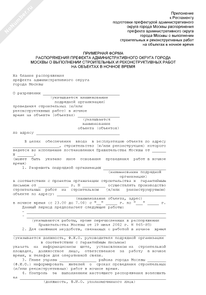 - 443Примерная форма распоряжения префекта административного округа города Москвы о выполнении строительных и реконструктивных работ на объектах в ночное время