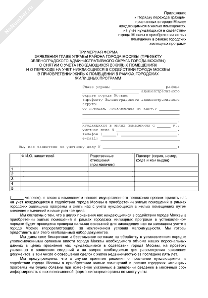 - 457Примерная форма заявления главе управы района города Москвы (префекту Зеленоградского административного округа города Москвы) о снятии с учета нуждающихся в жилых помещениях и о переходе на учет нуждающихся в содействии города Москвы в приобретении жилых помещений в рамках городских жилищных программ