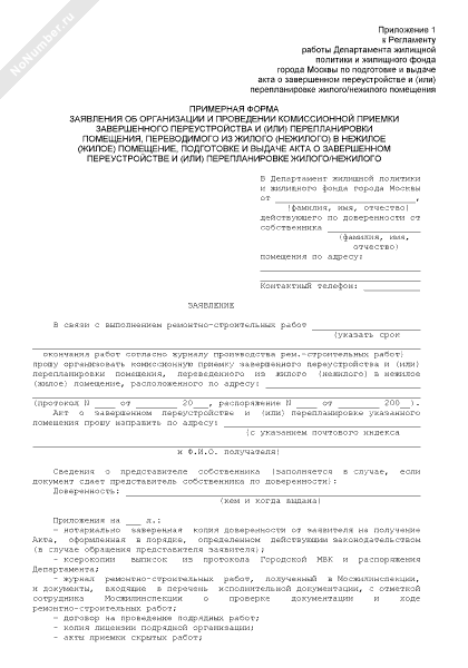 - 458Примерная форма заявления об организации и проведении комиссионной приемки завершенного переустройства и (или) перепланировки помещения, переводимого из жилого (нежилого) в нежилое (жилое) помещение, подготовке и выдаче акта о завершенном переустройстве и (или) перепланировке жилого/нежилого помещения