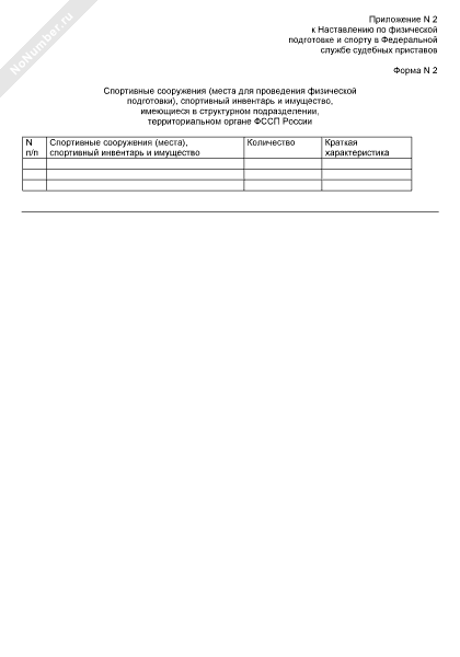 - 665Спортивные сооружения (места для проведения физической подготовки), спортивный инвентарь и имущество, имеющиеся в структурном подразделении, территориальном органе ФССП России (форма № 2)