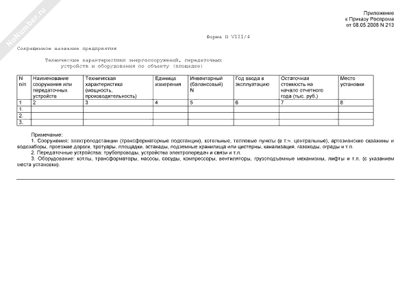 - 681Технические характеристики энергосооружений, передаточных устройств и оборудования по объекту (площадке) предприятия, находящегося в сфере ведения и координации Роспрома. Форма № VIII/4