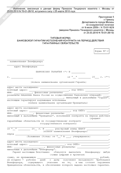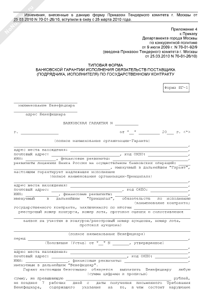 - 695Типовая форма банковской гарантии исполнения обязательств поставщика (подрядчика, исполнителя) по государственному контракту. Форма № БГ-1