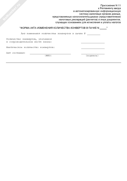 - 893Форма акта изменения количества конвертов в пачке документов, представленной в инспекцию ФНС России, выполняющую функции централизованной обработки данных