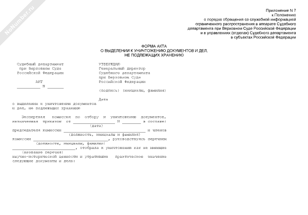 - 942Форма акта о выделении к уничтожению документов и дел, не подлежащих хранению в аппарате (управлениях, отделах) Судебного департамента при Верховном Суде Российской Федерации