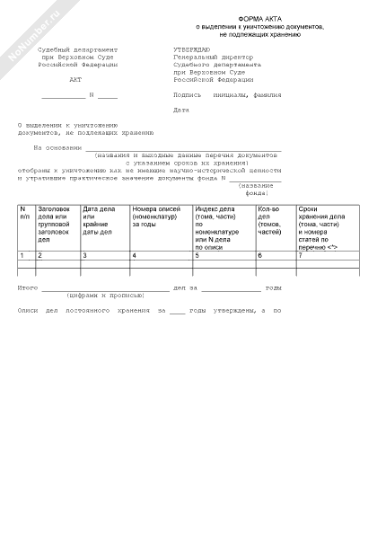 - 946Форма акта о выделении к уничтожению документов, не подлежащих хранению в Судебном департаменте при Верховном Суде Российской Федерации