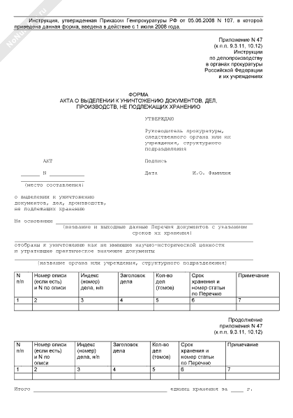 - 949Форма акта о выделении к уничтожению документов, дел, производств, не подлежащих хранению в органах прокуратуры Российской Федерации