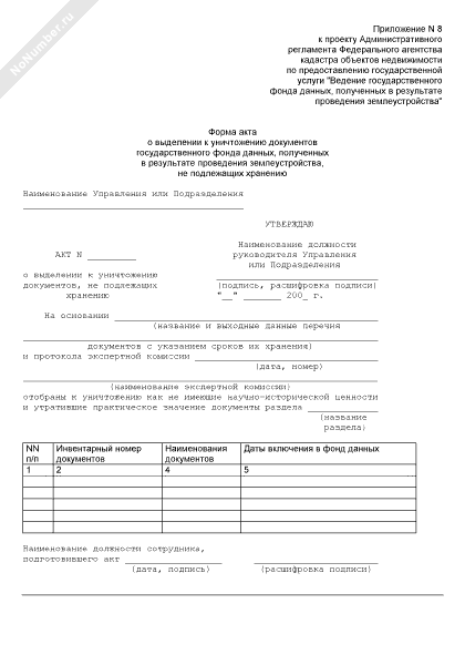- 943Форма акта о выделении к уничтожению документов государственного фонда данных, полученных в результате проведения землеустройства, не подлежащих хранению