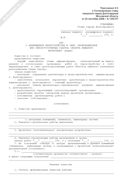 - 950Форма акта о завершенном переустройстве и (или) перепланировке или реконструктивных работах объекта нежилого назначения городского округа Долгопрудный Московской области