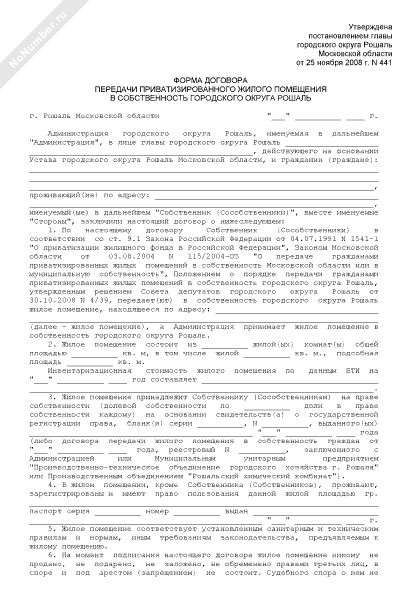 - 1330Форма договора передачи приватизированного жилого помещения в собственность городского округа Рошаль Московской области