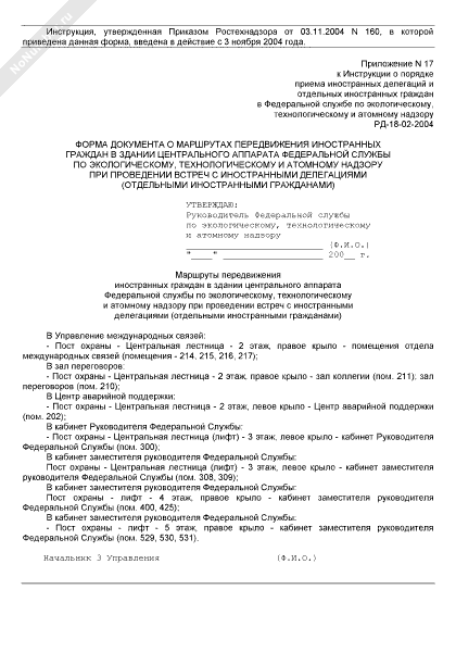 - 1337Форма документа о маршрутах передвижения иностранных граждан в здании центрального аппарата Федеральной службы по экологическому, технологическому и атомному надзору при проведении встреч с иностранными делегациями (отдельными иностранными гражданами)