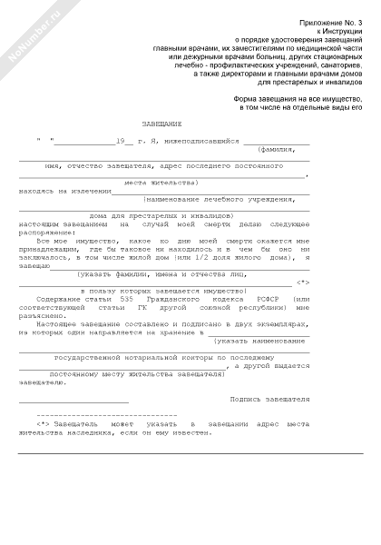 - 1551Форма завещания на все имущество завещателя, находящегося на излечении в лечебном учреждении, доме для престарелых и инвалидов