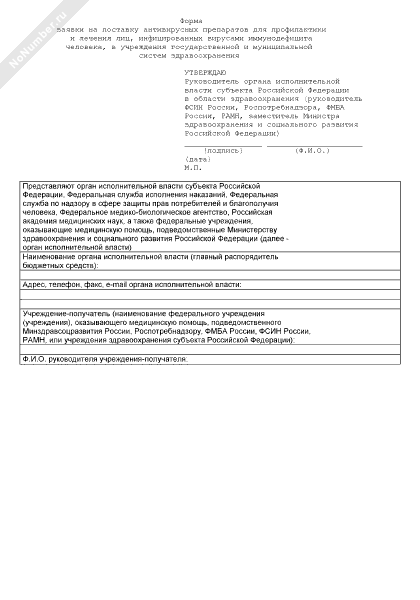 - 1781Форма заявки на поставку антивирусных препаратов для профилактики и лечения лиц, инфицированных вирусами иммунодефицита человека, в учреждения государственной и муниципальной систем здравоохранения