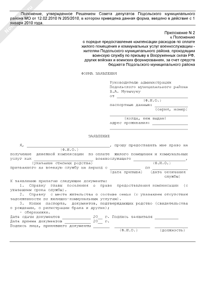- 1826Форма заявления члена семьи военнослужащего, проходящего службу по призыву и зарегистрированного на территории Подольского муниципального района Московской области, для получения компенсации расходов по оплате жилого помещения и коммунальных услуг
