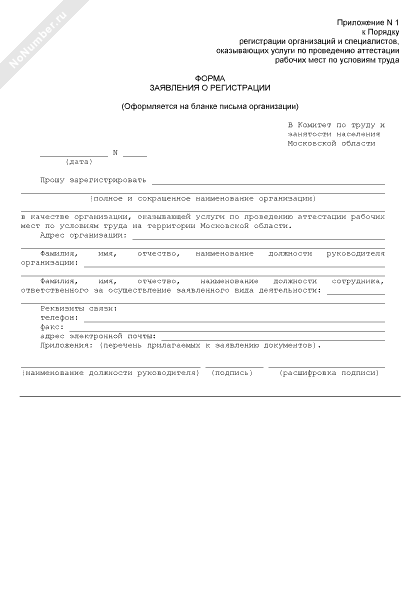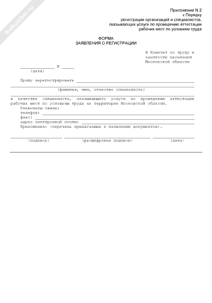 - 1832Форма заявления о регистрации специалиста, оказывающего услуги по проведению аттестации рабочих мест по условиям труда на территории Московской области