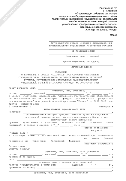 - 1828Форма заявления о включении в состав участников подпрограммы «Выполнение государственных обязательств по обеспечению жильем категорий граждан, установленных федеральным законодательством» федеральной целевой программы «Жилище» на 2002-2010 годы на территории Одинцовского муниципального района Московской области