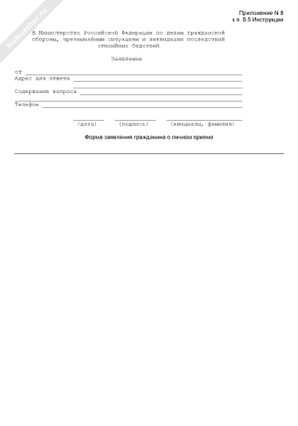 - 1865Форма заявления гражданина о личном приеме в системе Министерства Российской Федерации по делам гражданской обороны, чрезвычайным ситуациям и ликвидации последствий стихийных бедствий