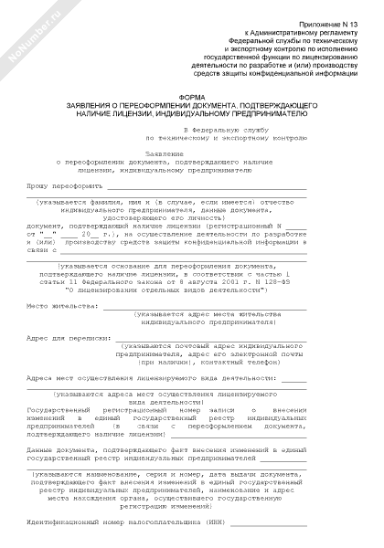 - 1879Форма заявления о переоформлении документа, подтверждающего наличие лицензии на осуществление деятельности по разработке и (или) производству средств защиты конфиденциальной информации, индивидуальному предпринимателю