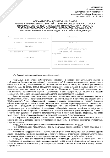 - 1979Форма и описание нагрудных знаков членов избирательных комиссий с правом совещательного голоса и наблюдателей, присутствующих при голосовании и подсчете голосов избирателей в участковых избирательных комиссиях при проведении выборов Президента Российской Федерации