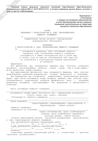 - 1976Форма заявления о переустройстве и (или) перепланировке нежилого помещения на территории городского поселения Наро-Фоминск Московской области