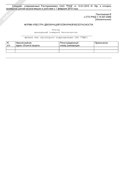 Форма реестра деклараций пожарной безопасности ОАО «РЖД» (обязательная)