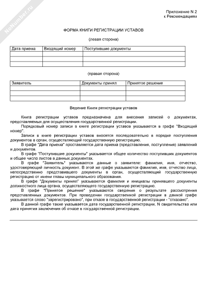 Форма книги регистрации уставов (рекомендуемый образец заполнения)