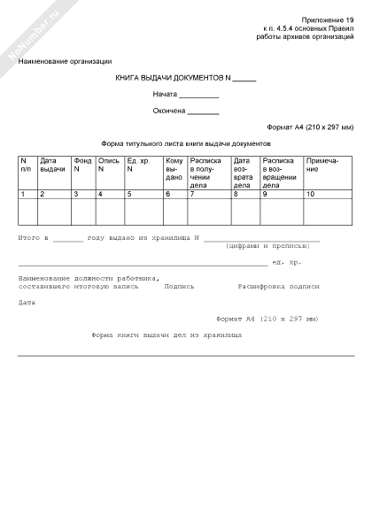 Форма книги выдачи дел из хранилища