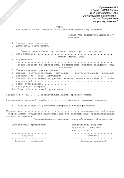 Форма наградного листа к нагрудному знаку «Золотой крест ФМБА России»