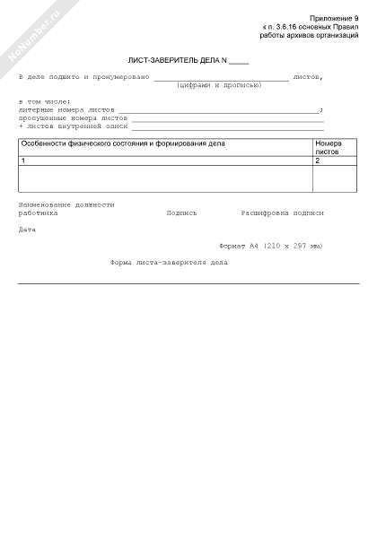 Форма листа-заверителя дела для учета количества листов в деле