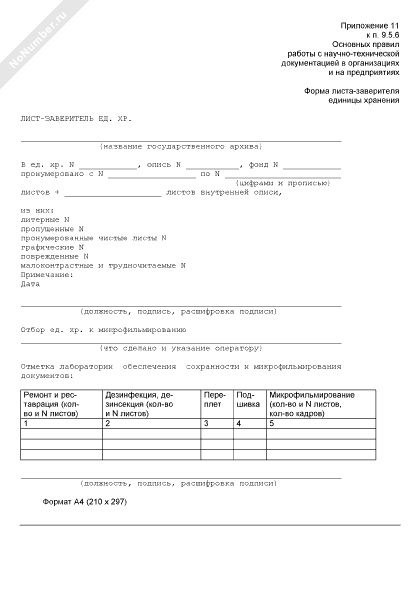 Форма листа-заверителя единицы хранения