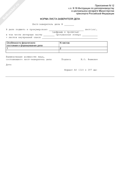 Форма листа-заверителя дела в центральном аппарате Минтранса РФ