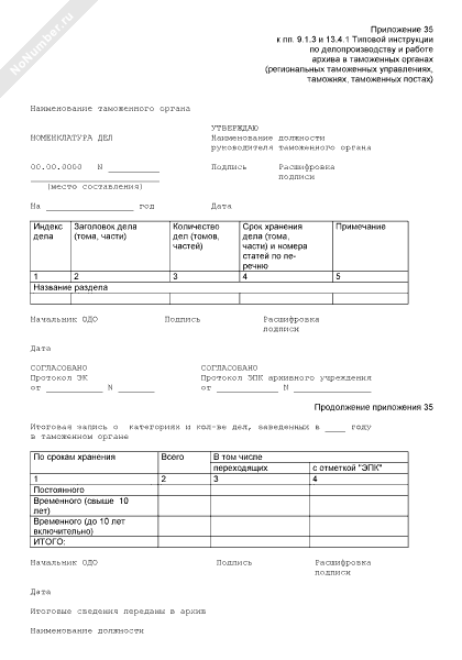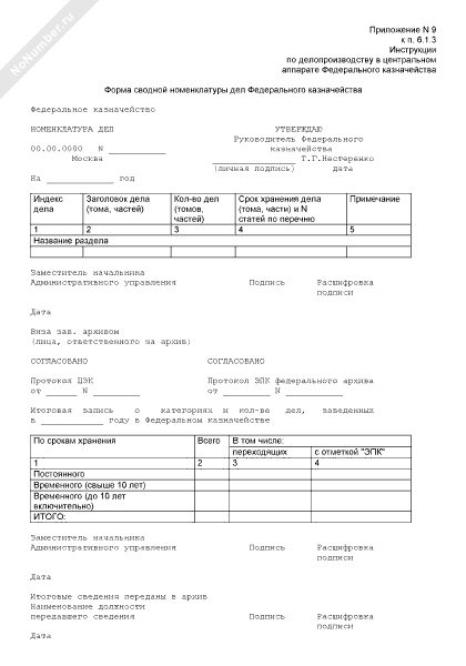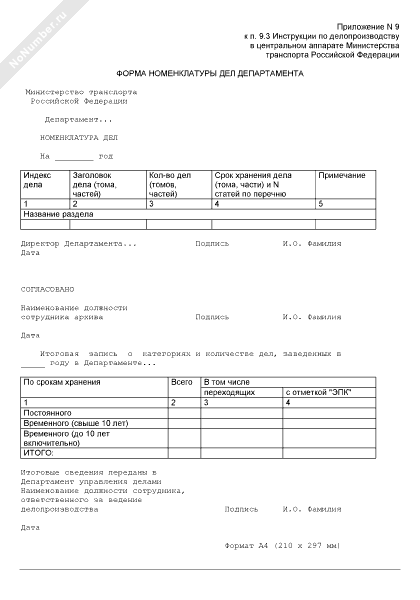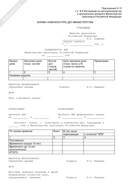 Форма номенклатуры дел Минтранса РФ (рекомендуемый образец заполнения)