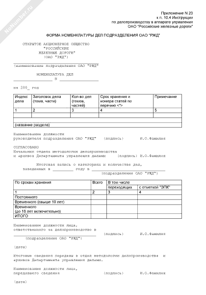 Форма номенклатуры дел подразделения ОАО «РЖД»