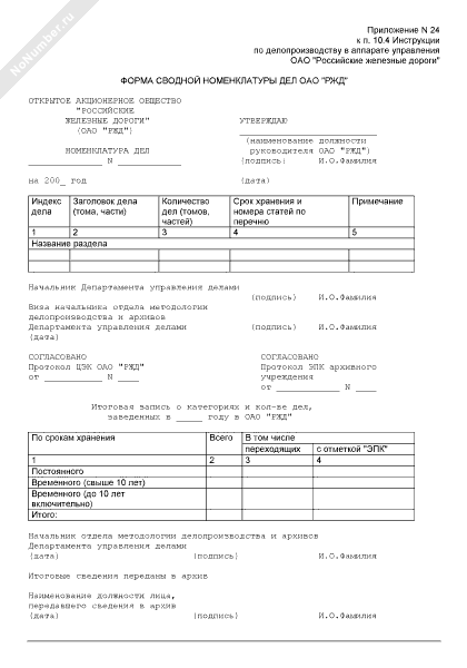 Форма сводной номенклатуры дел ОАО «РЖД»