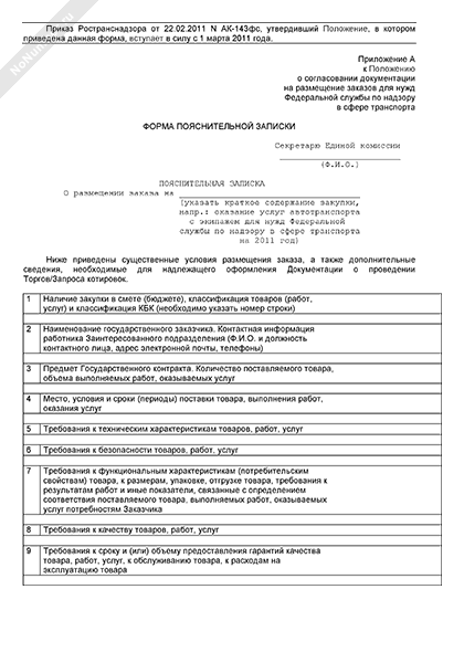 Форма пояснительной записки о размещении заказов для нужд Федеральной службы по надзору в сфере транспорта (рекомендуемый образец заполнения)
