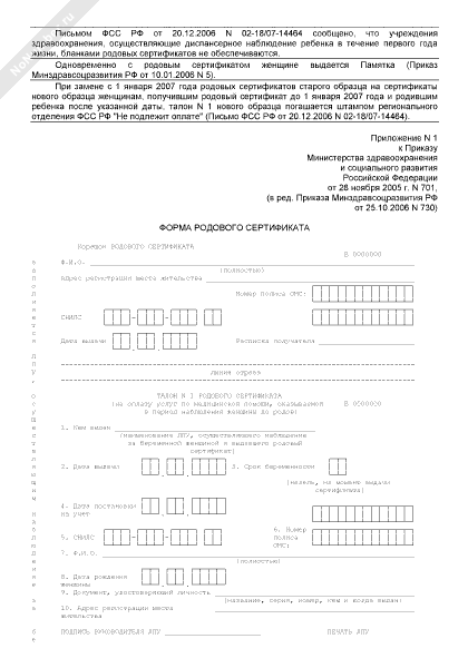 Форма родового сертификата (рекомендуемый образец заполнения)