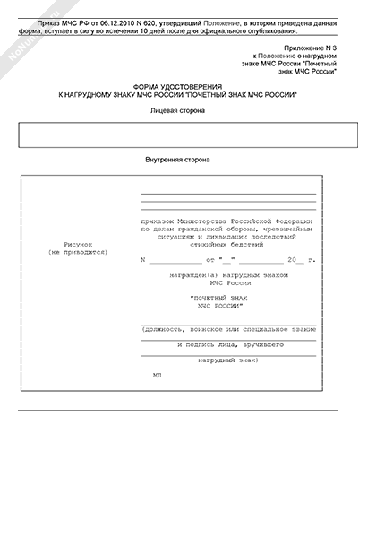- Источник– Приказ МЧС РФ от 06.12.2010 № 620
