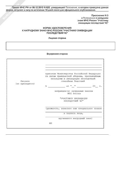 - Источник– Приказ МЧС РФ от 06.12.2010 № 620